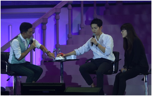 在长达两个小时的时间里,宋仲基一直风趣幽默的和粉丝亲密沟通互动,“给力”“完美”“吃饱了”都毫无压力的从仲基欧巴的口中说出,更是频繁的提到了李光洙欧巴,这么看来他可谓是仲基欧巴吃喝玩乐工作外出的居家必备!《太后》的经典桥段也是不出所料的出现在见面会中,特别的是其中三个经典桥段是宋仲基亲自挑选,并与主持人现场角色扮演,引来粉丝尖叫连连!